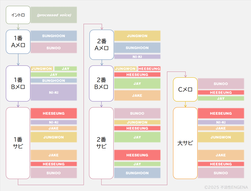 次いでソヌ、ジェイク・ジョンウォンの順でパート配分が多く、他のメンバーは同じくらいの比率になっています。