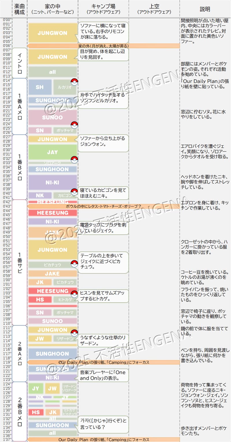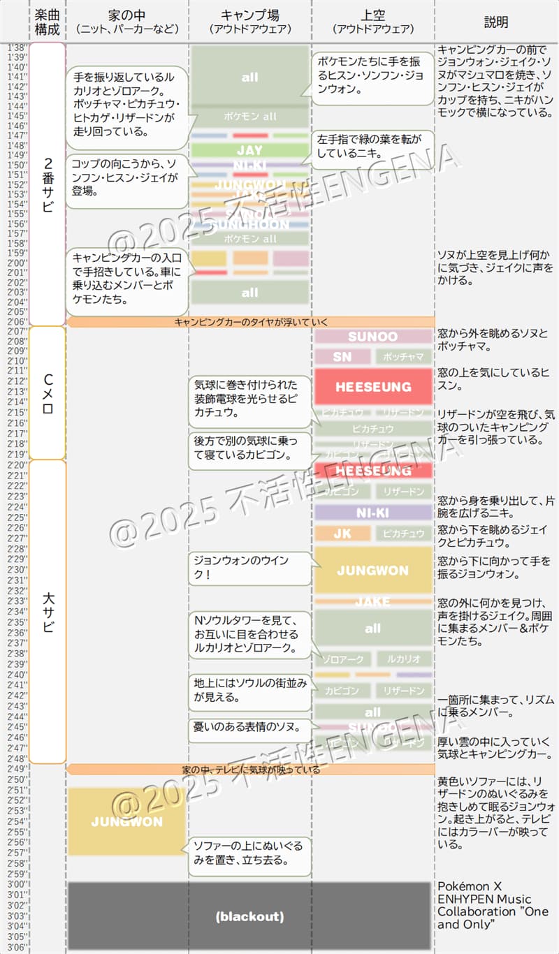 MV 中に登場するポケモンを、ENHYPEN メンバーのパートナーとして下表に整理しました。
